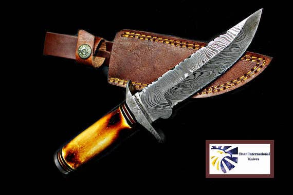 Titan International Knives Damascus Hunting/Camping knife is hand crafted to be functional and not just for looks. Utility Knife has over 22 hrs of work into it including forging, filing, fitting, grinding, polishing. The Burnt bone handle sits right into the hand, gives a very smooth grip which feels natural when held in the hand. The knife is weighted to have a balance point just around the bolster , to better help in hunting Jobs. Remarkable workmanship on this knife!